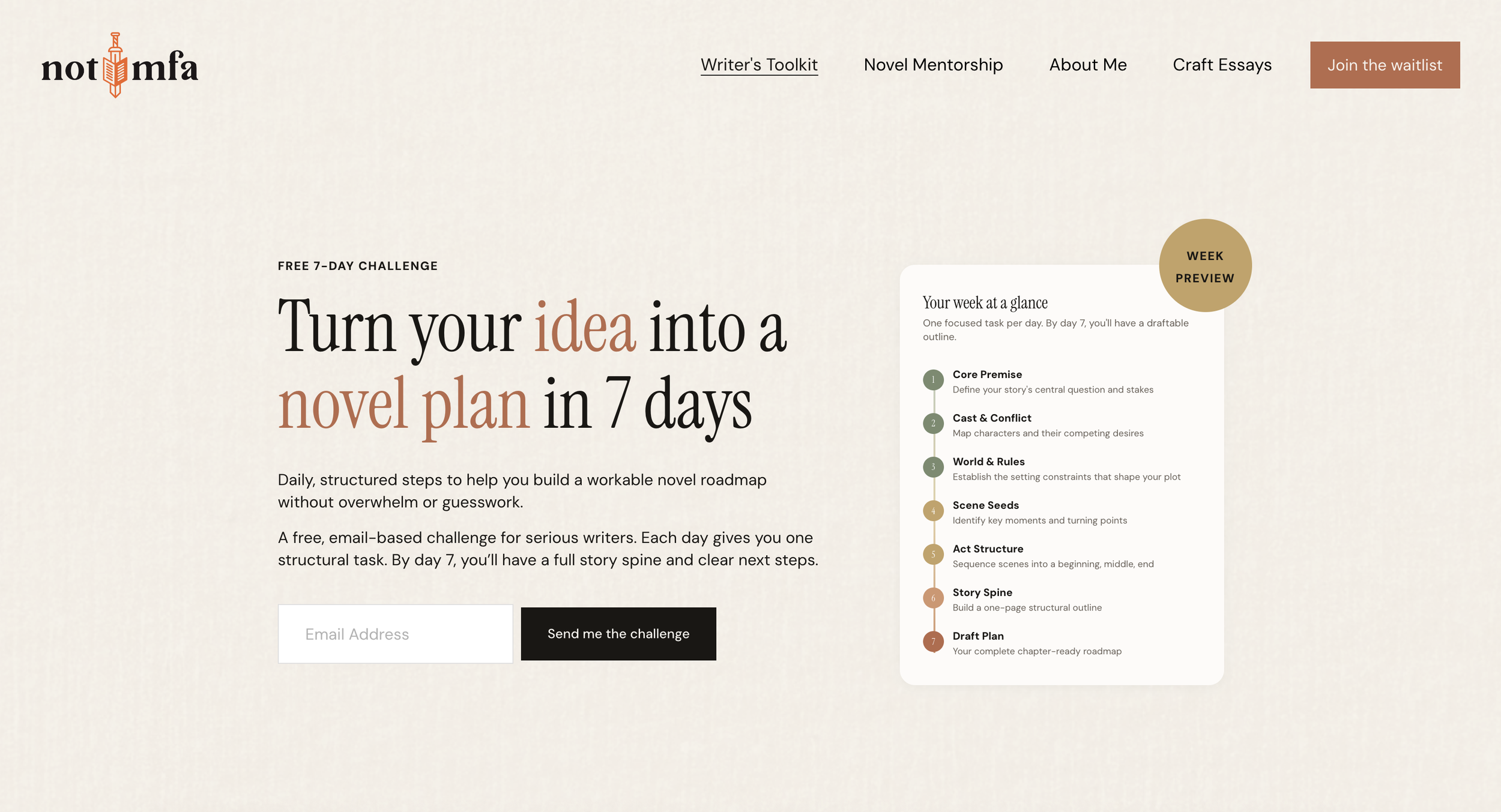 The challenge was to develop a visual identity and website that: 1) reflects the authenticity of such a program 2) appeals to the target audience (women interested in writing a novel aged 25-45) and 3) can demonstrate the overall teaching mastery of the Not MFA team.