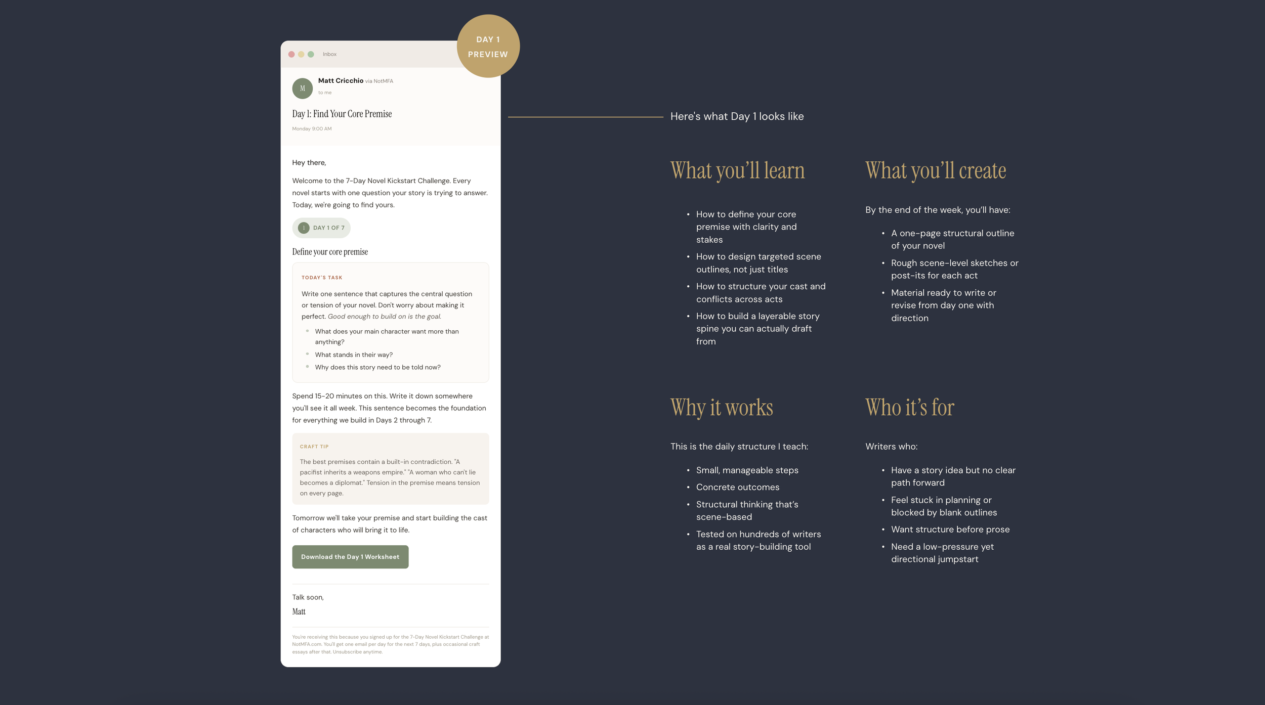 By providing lots of free value and resources upfront. I worked closely with Matt to develop lead magnets as well as designing his landing pages for a 7 day challenge for potential customers. I wanted to showcase the value of the email challenge, so mocked out a custom “week at a glance” view highlighting the emails a potential client would receive in order to be prompted to work on their novel plan.